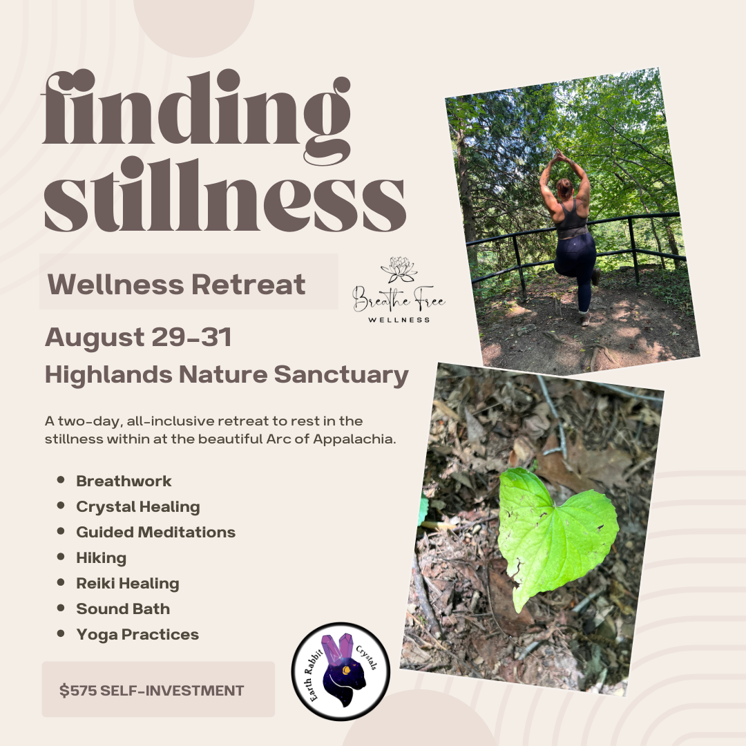 A two-day, all-inclusive retreat to rest in the stillness within at the beautiful Arc of Appalachia. Experience the healing qualities of the Highlands Nature Sanctuary while connecting with your true nature. Discover the ease that lies within each of us. Join Ashley from Earth Rabbit Crystals & Erin from Breathe Free Wellness for a weekend of pure bliss.